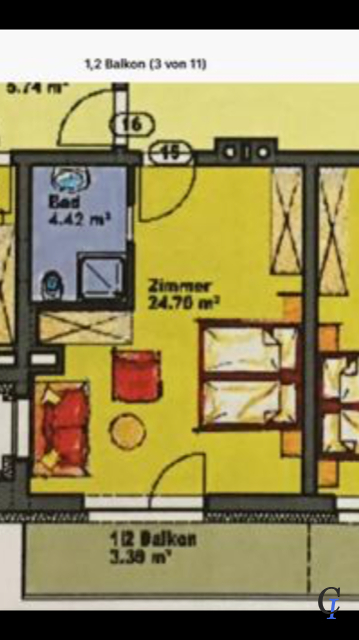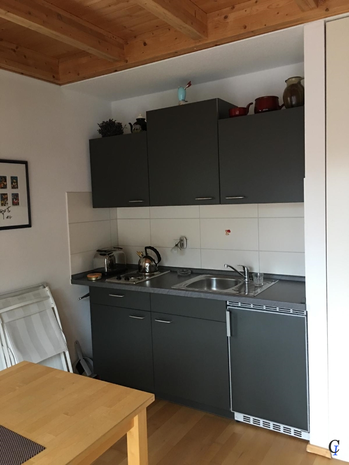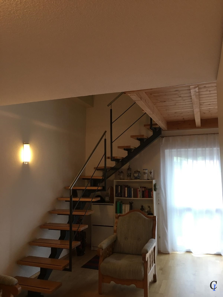 Im Wohnraum eine kleine Küchenzeile. Über eine kleine Treppe erreicht man den Schlafbereich mit Schräge. In der Wohnung befindet sich ein Duschbad ohne Fenster. Die Wohnung ist Barrierefrei und ist über eine Treppe oder Fahrstuhl zu erreichen. Zur Wohnung gehört ein Keller und ein Außenstellplatz für PKW.