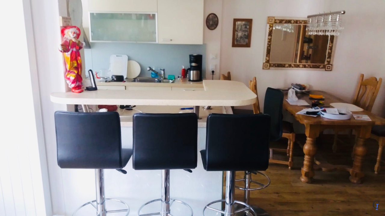 Die Küche hat auch einen Tresen mit Barhockern. Vom Wohnbereich gelangt man ebenfalls zum Balkon, dieser ist 13,32 qm groß und ist mit einer elektr. Markise