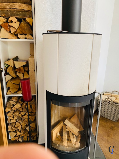 Holzfenster, Pellet Kaminofen, EBK, Plissee an den Fenstern, können käuflich erworben werden, durch Benutzung des Pellets Kaminofen mit Holz kann man die NK von 270,-€ auf 230,- gesenkt werden.